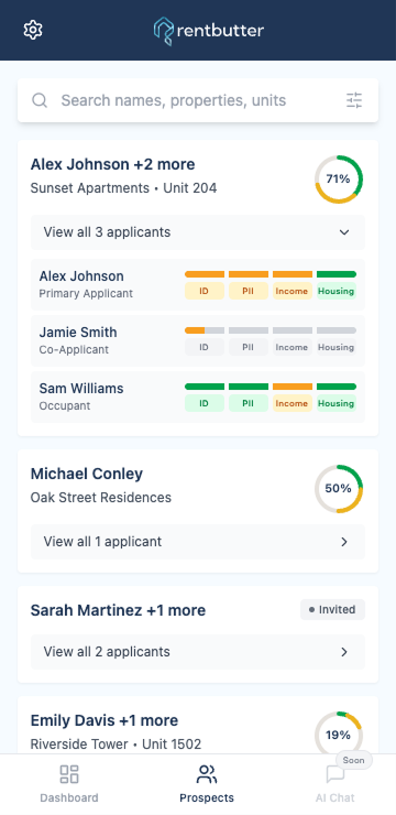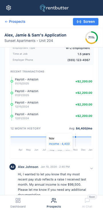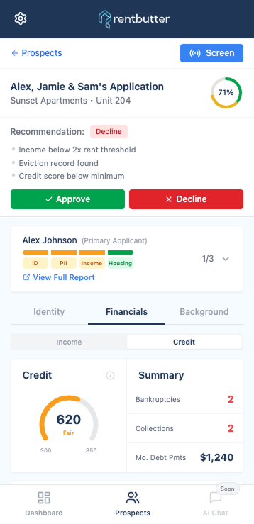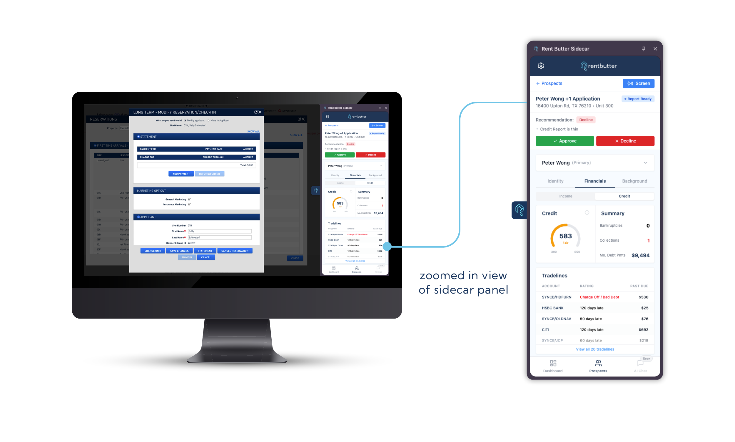 Full-power tenant screening, income verification, and background checks - in a side panel alongside your PMS.